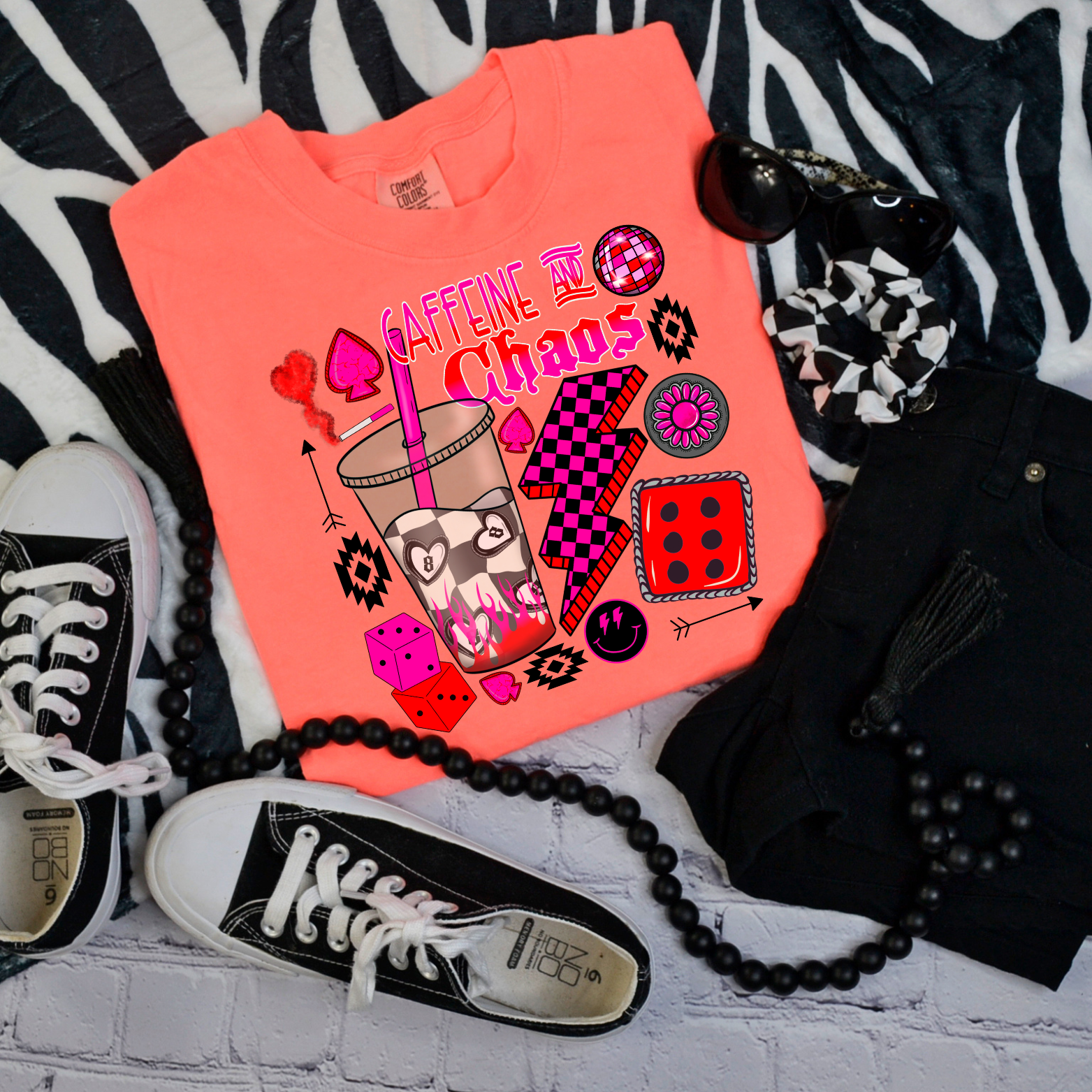 Embrace the beautiful mayhem of everyday life with our "Caffeine And Chaos" graphic tee. This trending statement piece perfectly captures your on-the-go lifestyle with bold design and soft comfort. Fuel your day and flaunt your truth – because sometimes caffeine is the only thing standing between you and total chaos. Wear your reality.