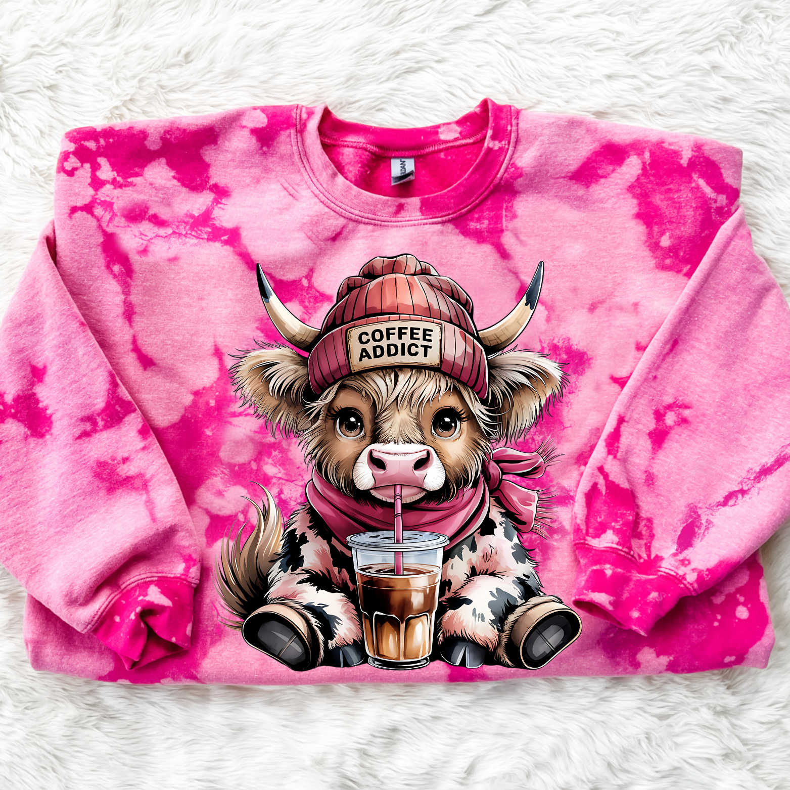 Indulge in the luxurious comfort of the Coffee Addict Cow Crew shirt. Made with bleached fabric and featuring a trendy design, this shirt is perfect for coffee lovers who want to show off their passion in style! Stay comfortable while fueling your addiction to the finest beverage.