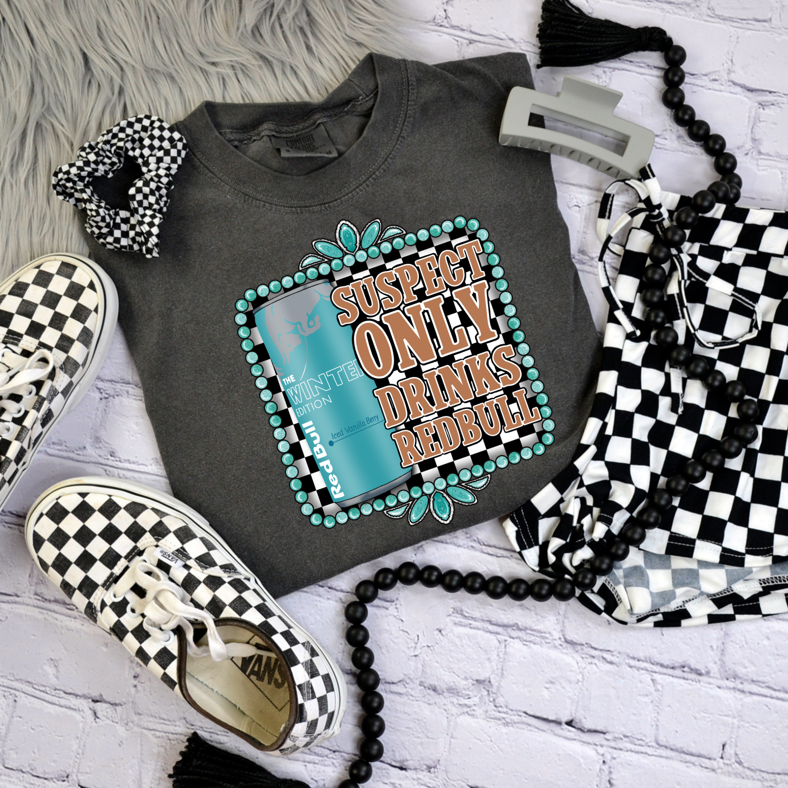 Fuel your day with our "Suspect Only Drinks Redbull" tumbler. This eye-catching checkered design isn't just trendy—it's a statement. Perfect for energy drink enthusiasts who refuse to compromise on style. The cute yet bold aesthetic makes this a must-have accessory that keeps your favorite beverage at the ideal temperature while turning heads wherever you go.